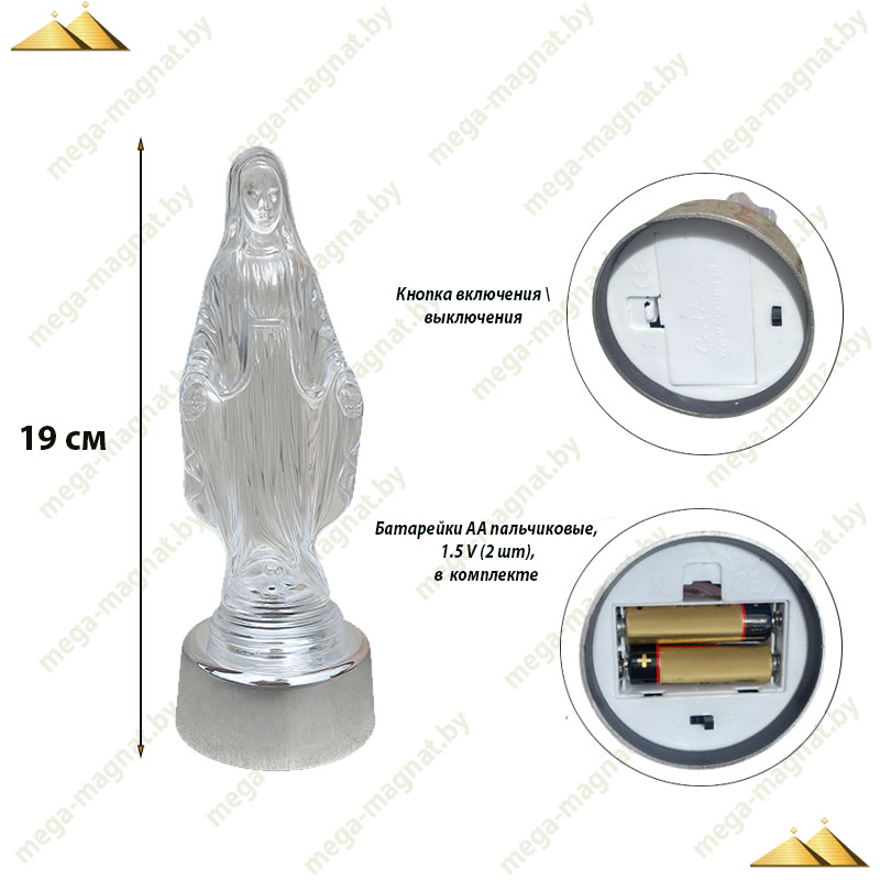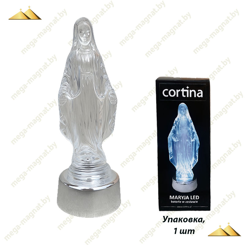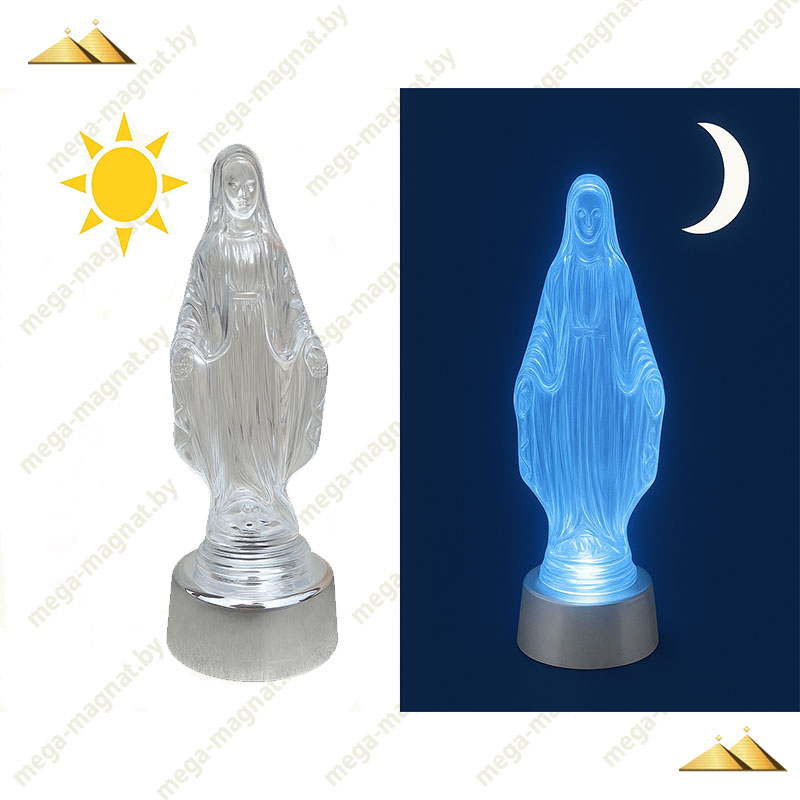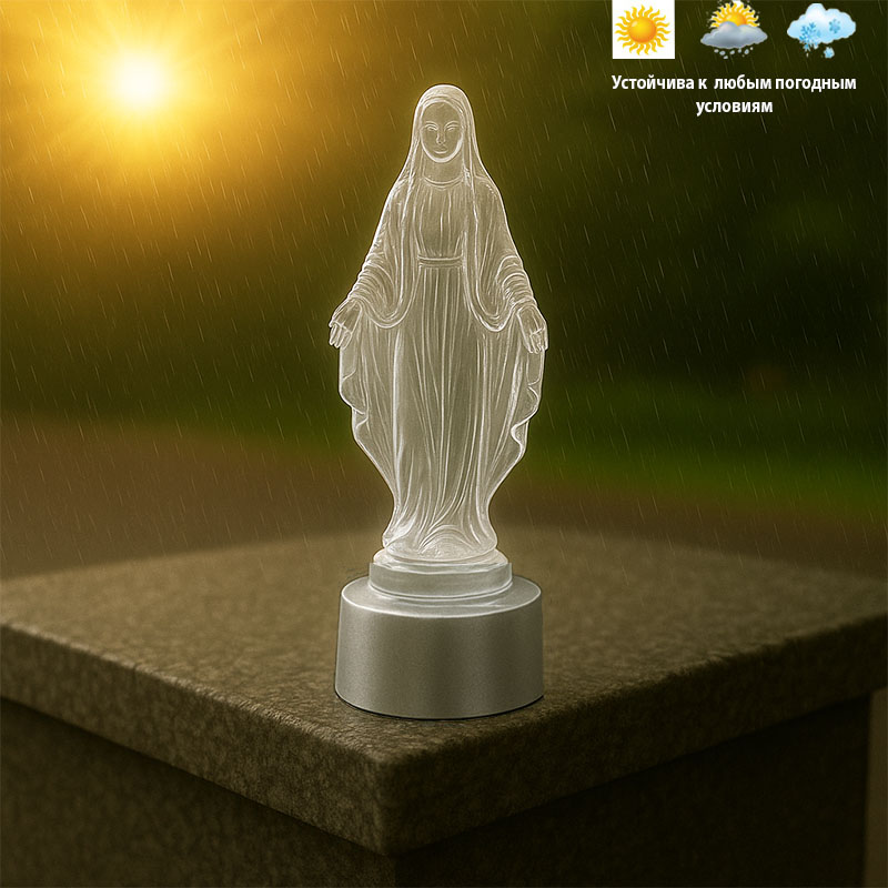 Небольшая декоративная фигурка Марии — светлый и трогательный элемент духовного декора. Выполнена из полупрозрачного материала, с чётко проработанными чертами: спокойный взгляд, плавные складки одежды, наклонённая голова. Внутри встроен LED-светодиод мягко подсвечивает фигурку снизу, создавая эффект лёгкого сияния. Светящийся образ Марии наполнит пространство ощущением покоя, веры и душевного тепла.