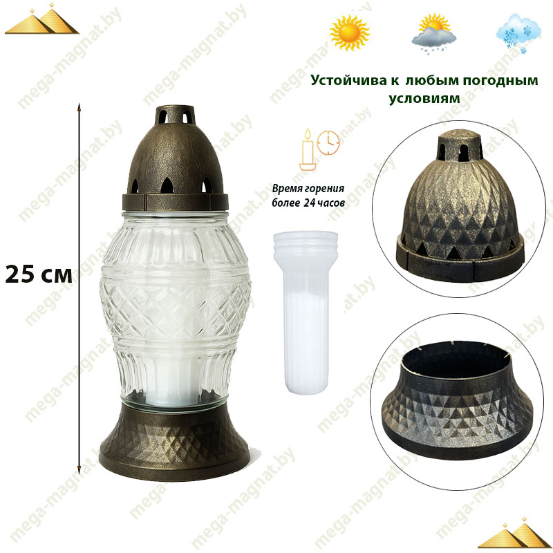 Элегантная лампада «Исида» небольшого размера сочетает в себе изысканность и символизм. Корпус выполнен из прозрачного стекла, благодаря которому свеча горит безопасно, создавая мягкое ровное свечение. Позолоченная крышка и подставка придают лампаде благородный и торжественный вид, подчёркивая её статус декоративного и духовного аксессуара.