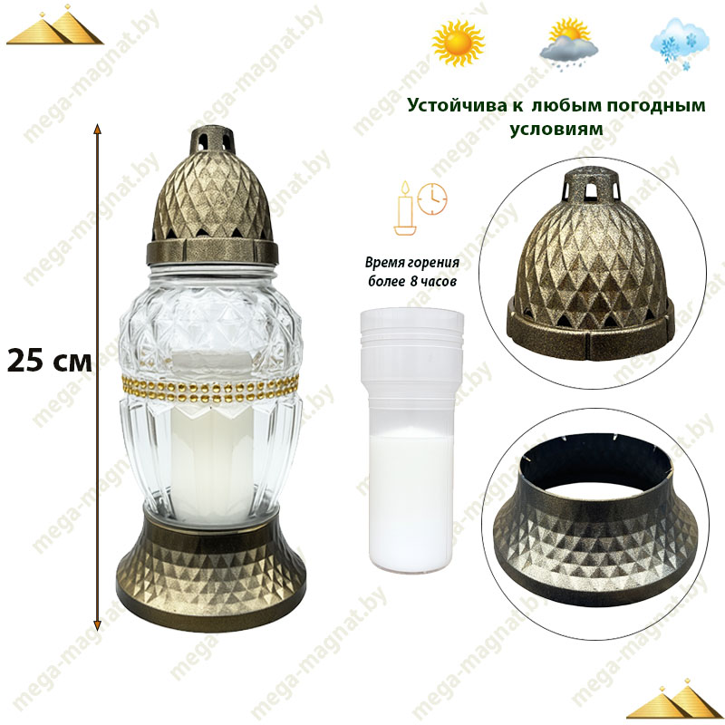 Лампада «Орион» — элегантная, компактная и аккуратно округлая, с прозрачным стеклом, сквозь которое мягко играет свет. Стекло украшено рельефными выпуклыми узорами, создающими ощущение глубины и переливов — словно маленькие звёзды, застывшие в стекле.
