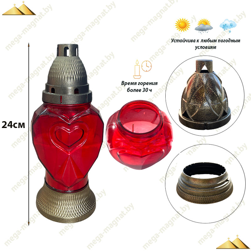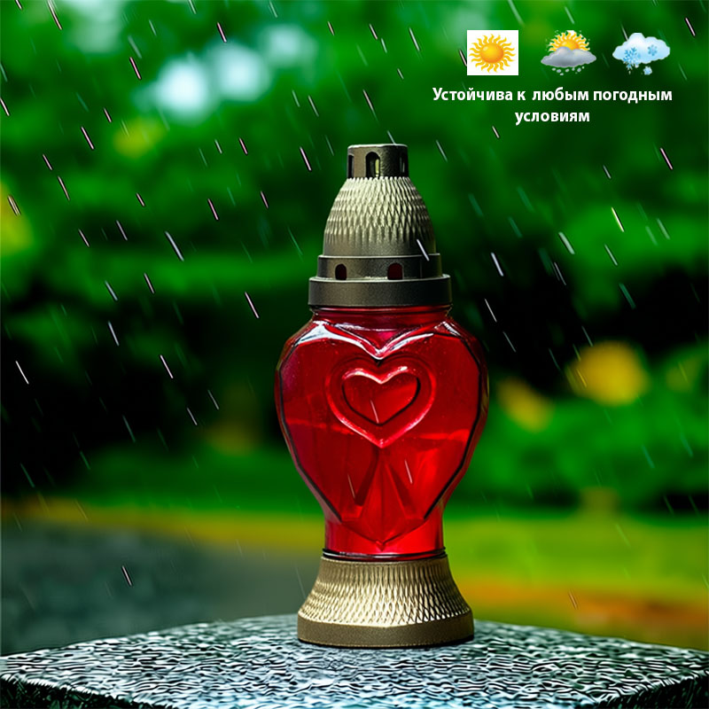 Сердце — изысканная форма и безупречный символ любви. Выполнена из насыщенного красного стекла, символизирует любовь, тепло и глубокую память. Особенность этой модели — красивая форма самой лампады, выполненная в виде сердца, что делает её особенно трогательной и выразительной. В центре аккуратно и чётко выбито дополнительное сердце, подчёркивающее идею духовной связи и вечной привязанности. Безупречная точность рисунка придаёт лампаде дорогой и изысканный вид.