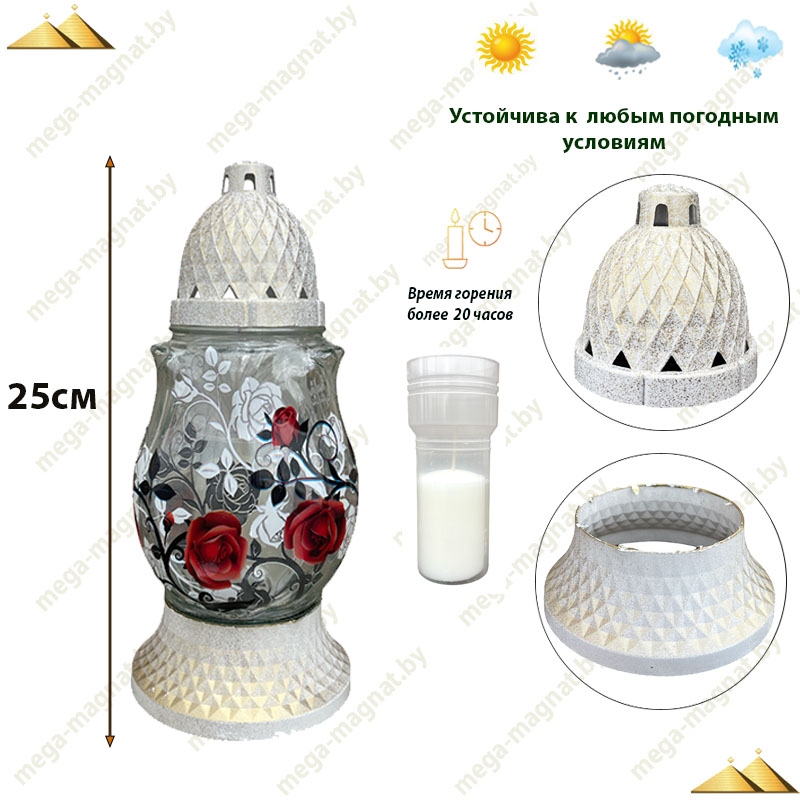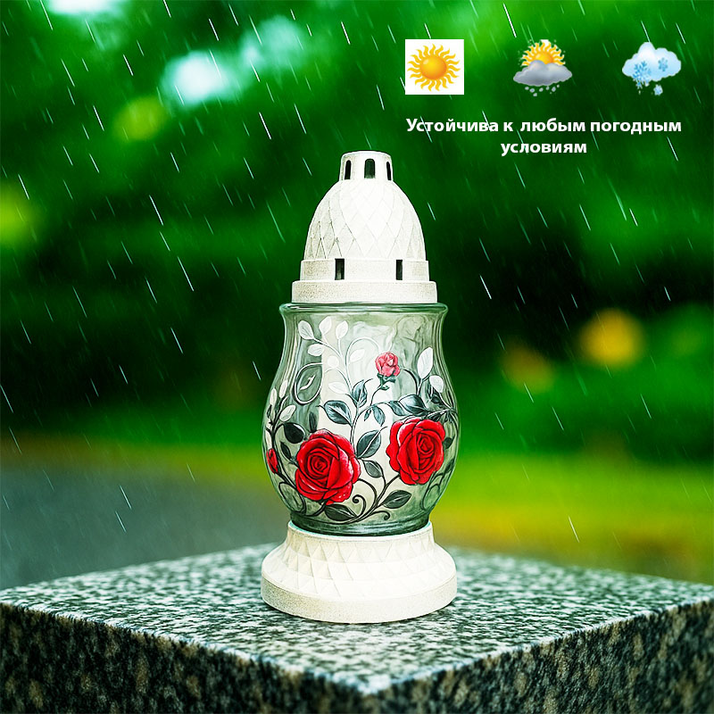 Лампада среднего размера, выполненная из прозрачного стекла с ярким декоративным рисунком. На поверхности изображены красные розы, переплетающиеся между собой плавными линиями. Розы нанесены чётко и насыщенно, поэтому рисунок хорошо выделяется даже при слабом освещении. Тонкие чёрные стебли создают аккуратный контраст, подчёркивают форму цветов и делают изображение более объёмным и живым. Белая крышка и белая подставка придают лёгкость и чистый аккуратный вид. Такой цвет подходит практически к любому интерьеру и смотрится сдержано и эстетично. Лампада выглядит нежно, но при этом нарядно, поэтому её можно использовать и в повседневных местах, и в праздничных.