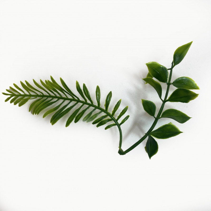 Элегантная декоративная добавка, состоящая из двух веточек: одна украшена ажурными листьями папоротника, другая — миниатюрными листочками манго. Сочетание различных текстур придаёт композиции глубину и выразительность, а насыщенно-зелёный цвет листвы делает добавку универсальной в сочетании с другими искусственными растениями. Благодаря монтажному отверстию у основания, добавку легко и удобно крепить на подбукетники, каркасы и декоративные заготовки.