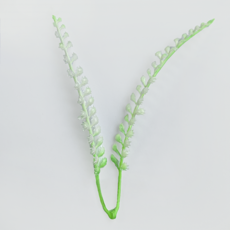 Элегантная декоративная веточка акации — компактная и аккуратная, отлично подойдёт для создания композиций, украшения букетов, венков и флористических изделий. Листья выполнены с высокой степенью детализации: сверху — светло-зелёные, к основанию — насыщенно-зелёные, с плавным переходом оттенков. Кончики листочков слегка отбелены, что придаёт композиции выразительность и натуральность.