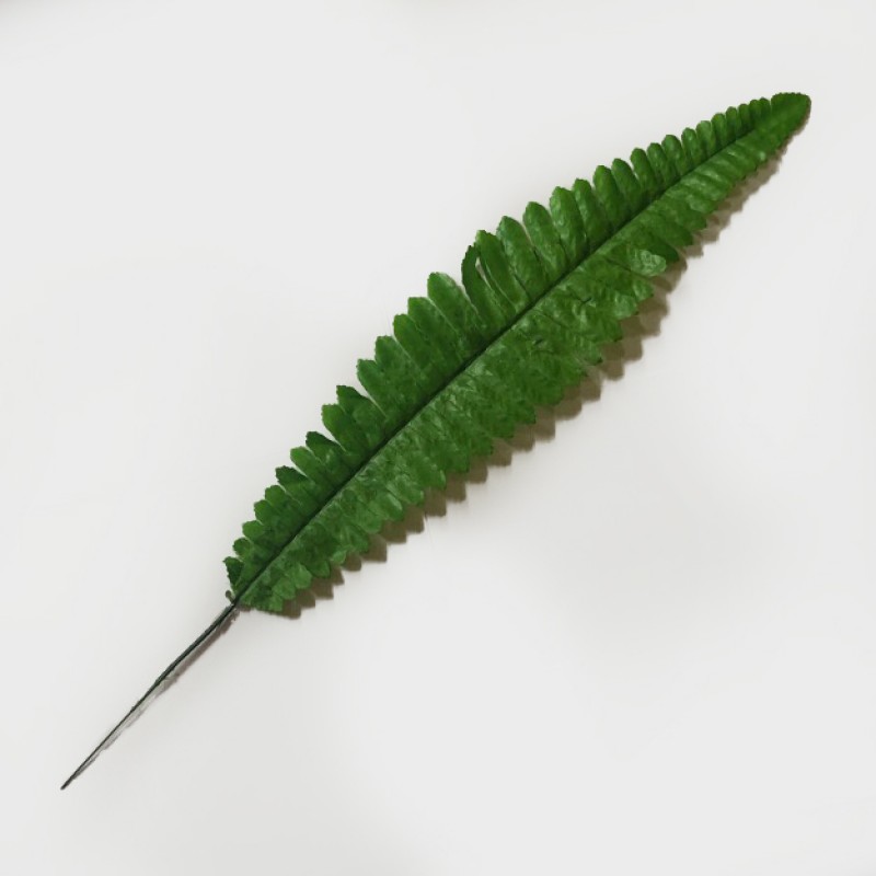 Лист папоротника имеет длину около 50 см, удлинённый и слегка изогнутый, что придаёт ему элегантный и стройный вид. Лист цельный, но внутри состоит из множества мелких листочков — сегментов, называемых филетами или листочками. Они располагаются по обеим сторонам центральной жилки в виде аккуратных, повторяющихся разрезов или зубцов, создавая характерный ажурный узор. Каждый маленький листочек вытянутый, с заострённым концом, что напоминает классическую структуру папоротника. Такая структура не только придаёт листу декоративность, но и способствует эффективному захвату света и воздуха для растения.