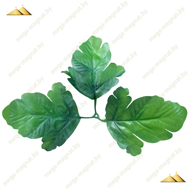 Тройной декоративный лист хризантемы — это флористический элемент, состоящий из трёх характерных листиков, расходящихся в разные стороны. Изделие выполнено в натурально-зелёном цвете с имитацией прожилок и резных краёв. В основании листа предусмотрено отверстие для насадки на подбукетник, что делает его удобным в использовании при сборке букетов и композиций.