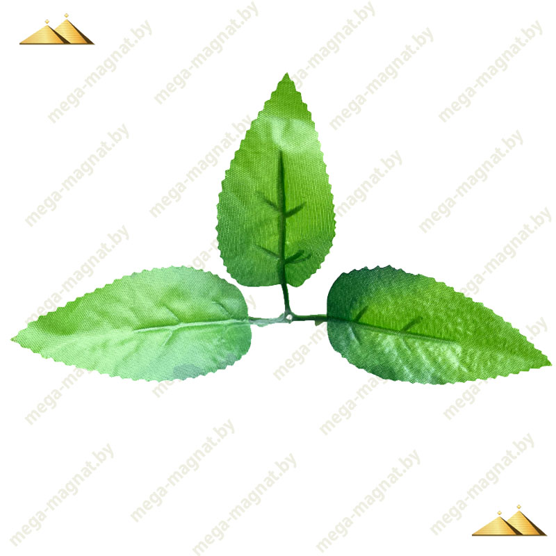 Тройной декоративный лист розы с реалистичной формой. Конструкция включает три слегка удлинённых листочка, характерных для настоящей розы: с заострённым концом, зубчатым краем и чёткими прожилками. Все листики расходятся в стороны, создавая объём. В основании имеется отверстие, которое позволяет легко насадить лист на подбукетник или стебель. Декоративный лист розы придаст вашим композициям изысканность и завершённость, сохраняя эстетичность без ухода.