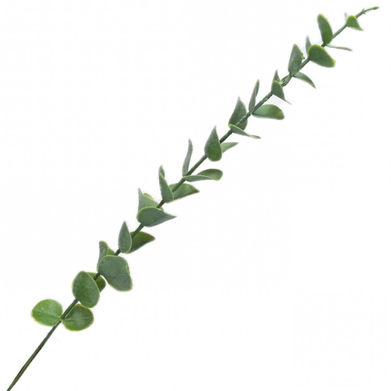 Эта ветка эвкалипта длиной 44 см выполнена из пластика и оснащена гибким стеблем, позволяющим легко придать ей любую форму. Листья на ветке расположены равномерно: у основания — маленькие аккуратные листики, а ближе к концу они становятся чуть крупнее, создавая естественный и гармоничный переход. Листья имеют классическую овальную форму, характерную для эвкалипта, с натуральной текстурой и мягким зелёным оттенком, что придаёт ветке свежий и живой вид.