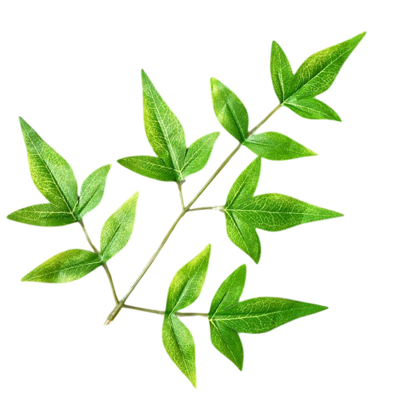 Декоративная ветка пиона длиной 23,5 см выполнена из прочного материала с реалистичной имитацией натуральной листвы. Листья расположены густо и расходятся в разные стороны, создавая эффект объёмности и пышности. Каждая жилка и форма листа тщательно проработаны, что делает ветку максимально приближённой к настоящей. Гибкий стебель позволяет легко придавать ветке нужную форму, а отверстие в основании используется для крепления на подбукетник или флористическую проволоку — это обеспечивает удобное и надёжное фиксирование в букетах и композициях.