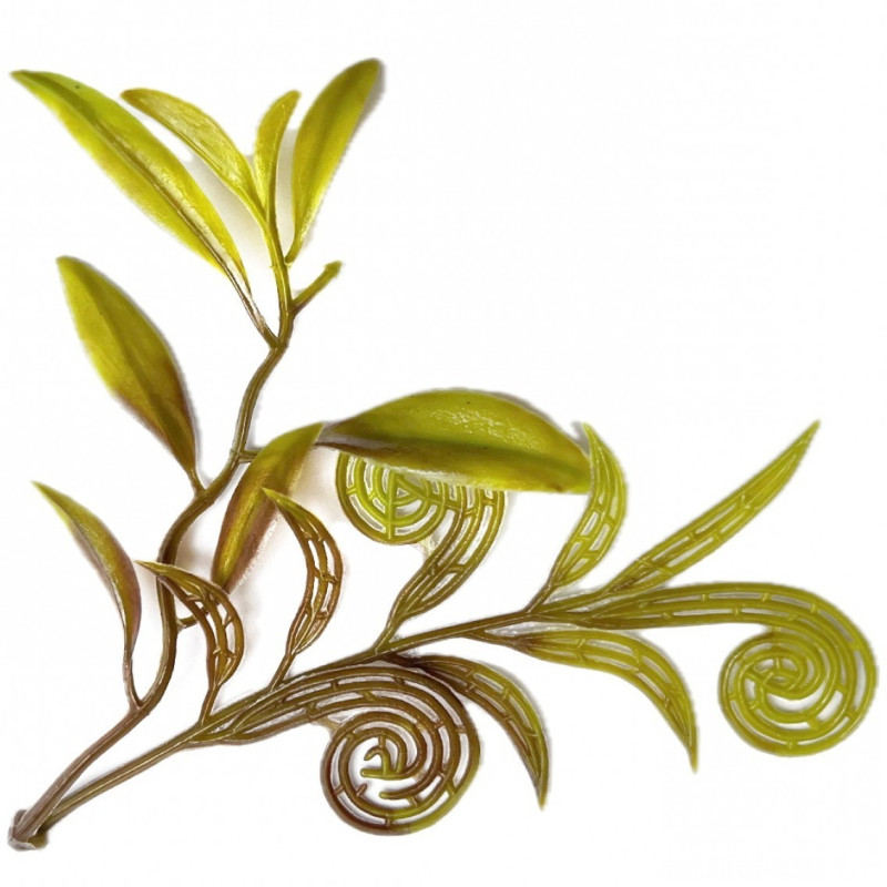 Элегантная декоративная добавка состоит из двух веточек длиной по 12 см. На одной из них расположены аккуратные листики, а на второй — листики чередуются с изящными завитками, создавая эффект лёгкости и движения. Цвет хаки придаёт изделию стильный и природный вид. Он универсален и хорошо сочетается как с яркими, так и с приглушёнными оттенками в композициях. Благодаря отверстию у основания веточек, добавку легко и удобно крепить на подбукетники и каркасы композиций.
