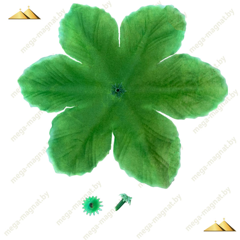 Весенний декоративный элемент диаметром 14 см состоит из 6 листиков с закруглёнными кончиками и аккуратными вырезами-рубцами, что придаёт им естественный и свежий вид. Цвет — насыщенный и гармоничный, создаёт ощущение живой зелени. Материал — плотная ткань, сохраняющей форму и оттенок длительное время.